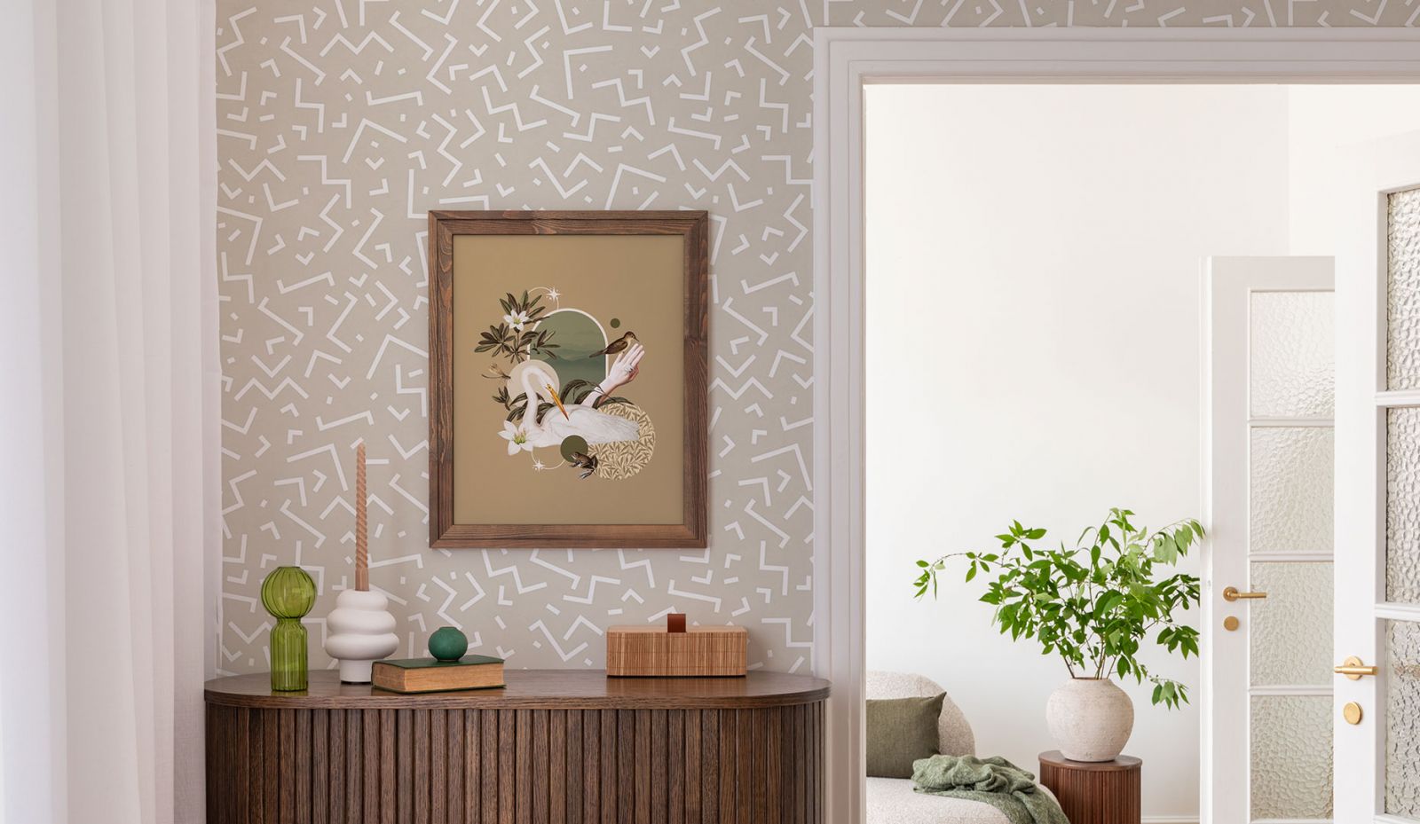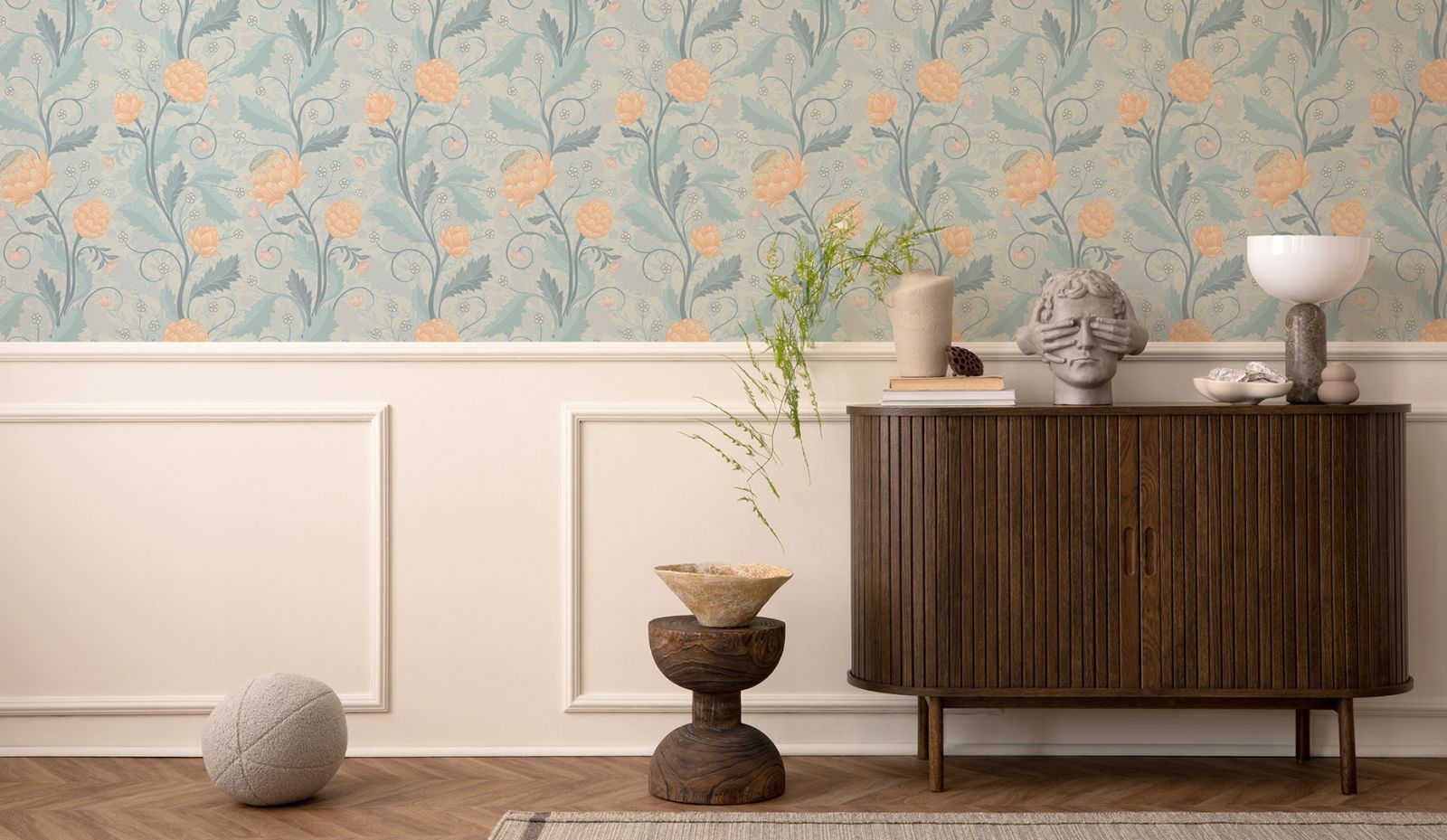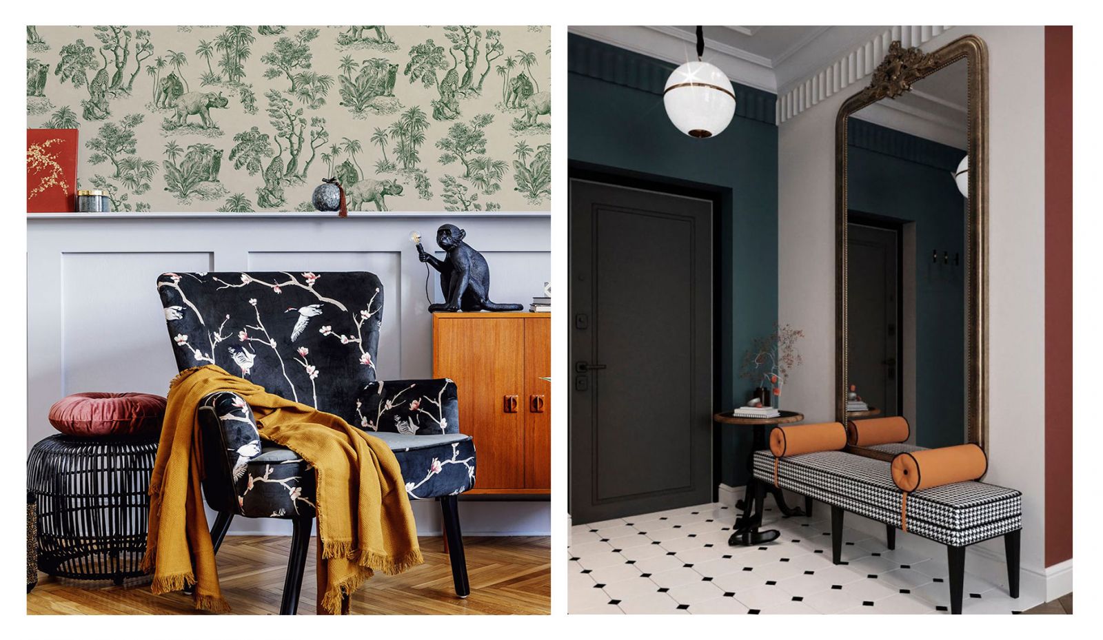 Немного природы ещё никогда и никому не навредило. Так и в интерьере. Роскошь и пафос стиля ар-деко можно сочетать с природными элементами стиля эко. Используйте в отделке натуральное дерево, камень, растительные принты. Повесьте на стену резное металлическое панно или необычной формы зеркала