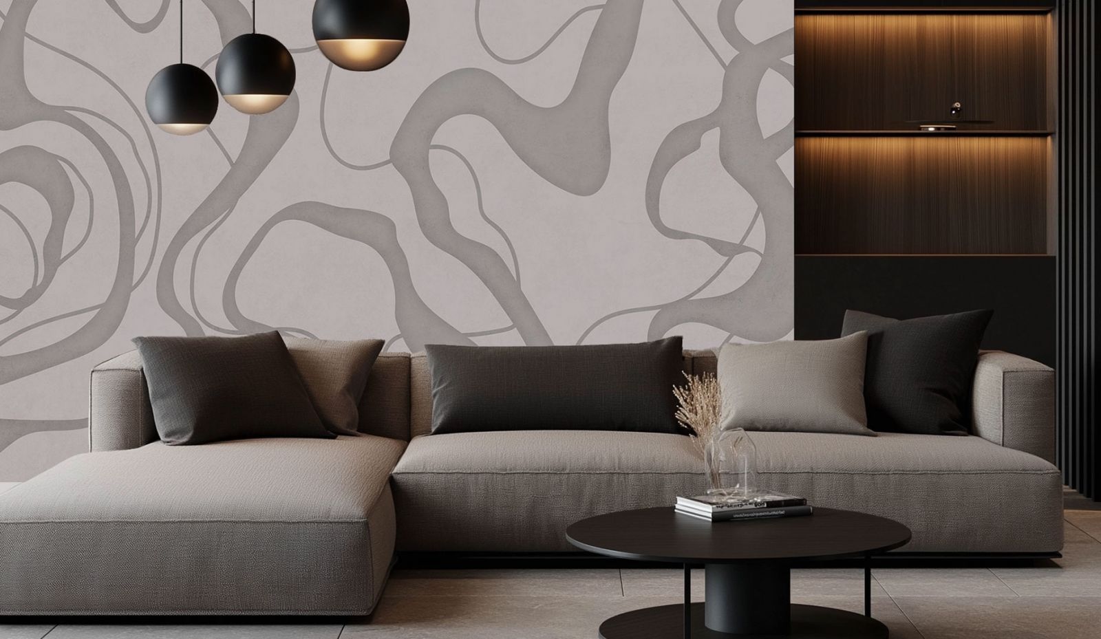 Современные абстрактные формы, необычное стилизованное освещение, смелые принты вполне могут сочетаться с классической цветовой гаммой  и мебелью.